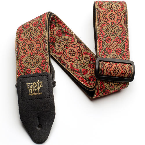 Pasek do gitary wykonany z trwałej i wygodnej polipropylenowej plecionki. Seria Polypro. Zakończenia skórzane. Regulowana długość od 104 cm do 182 cm. Wzór żakardowy: Crimson Paisley Jacquard Strap.
