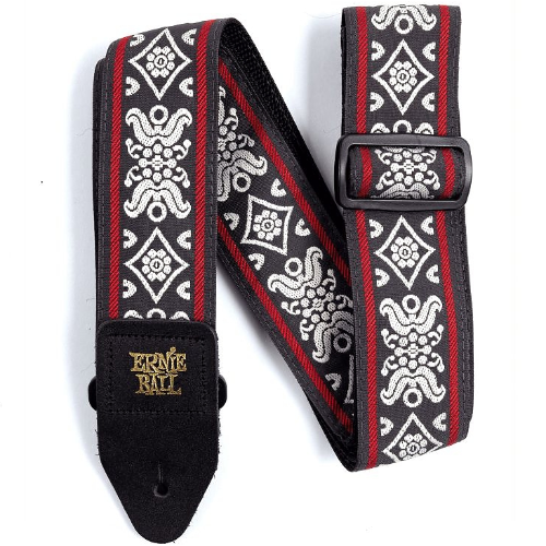 Pasek do gitary wykonany z trwałej i wygodnej polipropylenowej plecionki. Seria Polypro. Zakończenia skórzane. Regulowana długość od 104 cm do 182 cm. Wzór żakardowy: Blackjack Red Jacquard Strap.