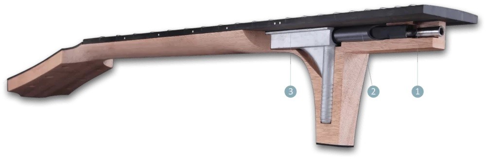 Precyzyjny pręt regulacyjny o podwójnym działaniu utrzymuje stabilność szyi i umożliwia precyzyjną, dwustronną regulację gryfu. Pręt regulacyjny umieszczony jest w bardzo sztywnej obudowie z włókna węglowego, która umożliwia bardzo płynny i kontrolowany setup, zapewniając najlepszą grywalność i trwałą optymalną konfigurację.