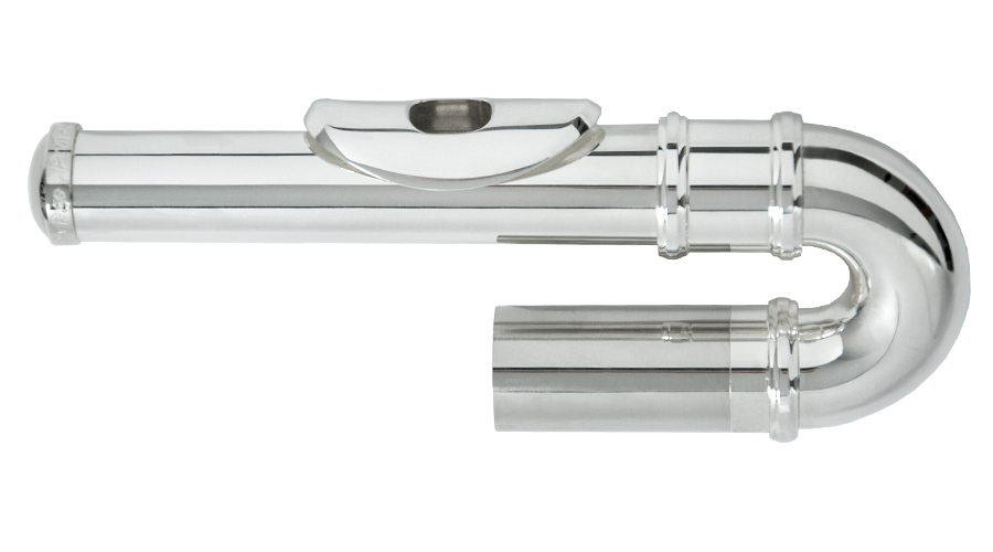 Posrebrzana, zakrzywiona głowa ze srebrną płytką ustnikową i kominkiem do fletu poprzecznego.