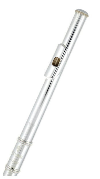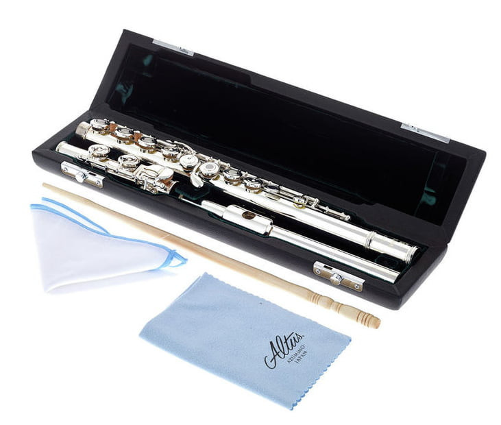 Model szkolny, posrebrzany ze srebrną głową Altus Z, otwarte klapy, E-mechanika, wysunięte G (offset), stopka C. W komplecie futerał, pokrowiec, zatyczki do klap oraz akcesoria czyszczące.