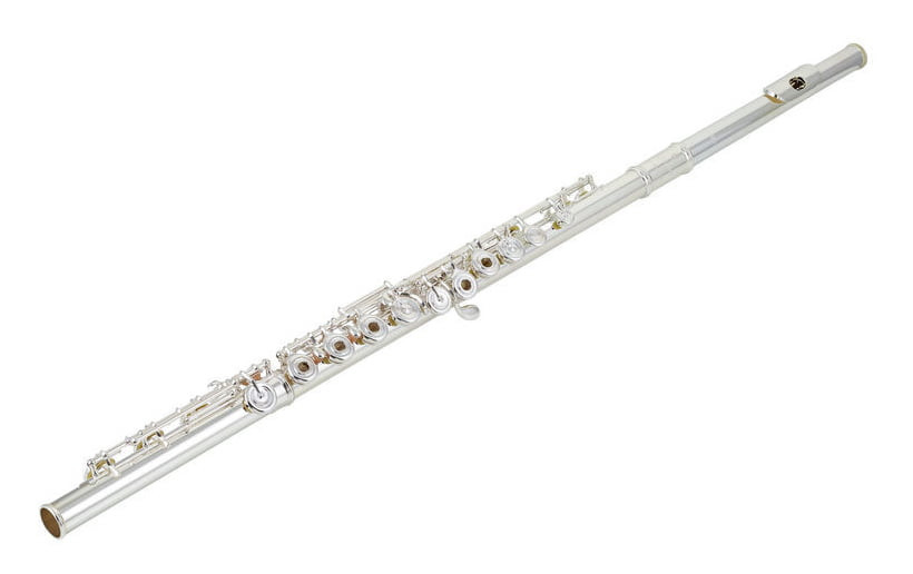Model szkolny, posrebrzany ze srebrną głową Altus S, otwarte klapy, E-mechanika, wysunięte G (offset), stopka H. W komplecie futerał, pokrowiec oraz akcesoria czyszczące.