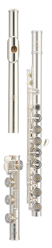 Model mistrzowski, ze srebrną głową MX (958) ze złotym 14K kominkiem, srebrnym korpusem (958) i srebrnym mechanizmem, złote 14K lutowane akustycznie stożkowe otwory tonowe, otwarte klapy, E-mechanika, wysunięte G (offset), stopka H. W komplecie futerał, pokrowiec, zatyczki do klap oraz akcesoria czyszczące.