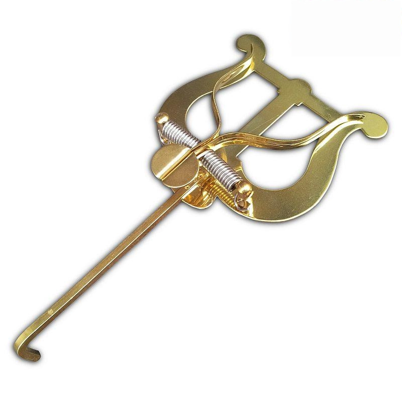Uniwersalna, zakrzywiona lirka marszowa na nuty o długości 16 cm, z pulpitem średniej wielkości, mosiężna w kolorze złotym.
