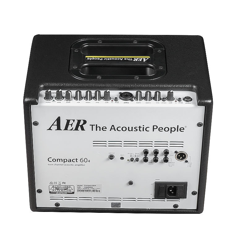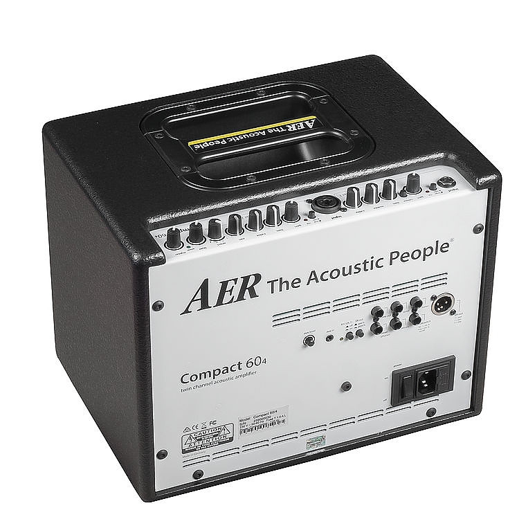 Wzmacniacz 60W do instrumentów akustycznych, wersja IV. Dwa kanały wejściowe (kanał 1 wejście liniowe 1/4" z przełączaną czułością, kanał 2 wejście mikrofonowo/liniowe - gniazdo XLR-1/4"- microphone input stage 48 V). Zasilanie Phantom na kanale 1 (z możliwością wyłączenia - 9 V phantom power). Niezależna regulacja barwy dla każdego wejścia (kanał 1 trzypunktowa z włączanym filtrem COLOUR i diodą CLIP, kanał 2 dwupunktowa). Wbudowany cyfrowy procesor efektów (odłączany opcjonalnym przełącznikiem nożnym) z dwoma ustawieniami: reverb lub delay oraz regualcją nasycenia niezależną dla każdego z kanałów, 8" głośnik dwucewkowy, analogowy procesor wzmacniacza: limiter, subsonic filter i enhancer. Wejście Aux In, np do podłączenia CD lub innego źródła - stereo mini jack 1/4'' (100mV - 4V, nom. 500mV), 22KOhm. Gniazdo 1/4" powrotu zewnętrznego efektu (odłączane opcjonalnym przełącznikiem nożnym). Gniazda wyjściowe 1/4" do podłączenia słuchawek, tunera, liniowe, wysłania sygnału do zewnętrznego efektu, symetryczne XLR Direct Out, wyjście DI: symetryczne XLR, po korekcji preampu, możliwość przełączenia przed lub po efektach. Bardzo małe gabaryty H 260mm, W 325mm, D 235mm. Obudowa sklejkowa - birch plywood - (12mm/0.47"), Pokrowiec Gig Bag super-quality z logiem Aer. Kolor: czarny. Waga: 7.1 kg (14.3 lbs).